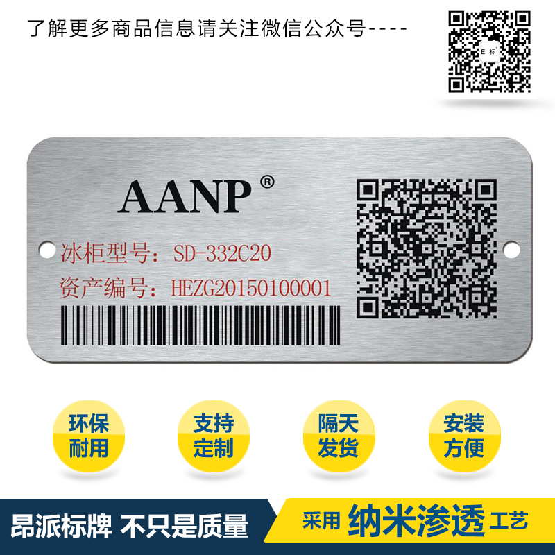 固定資產(chǎn)二維碼銘牌標牌 時間:2018-05-18 19:33:42 分類:金屬二維碼 瀏覽:次 金屬二維碼采取高科技印刷工藝以及質量優(yōu)勢: 金屬二維碼---進口納米鋁板---高科技德國滲透印刷技術---耐摩擦,耐溶劑,耐高溫,抗摩擦,耐紫外線,耐化學品性,耐腐蝕性,滲透印刷技術做出來的金屬二維碼使用壽命長,不易掉色,金屬二維碼識別率快,掃描率高,并能光潔如新。 分享收藏: 上一個: 樹木二維碼牌銘牌標牌 下一個: 機器二維碼銘牌標牌 相關產(chǎn)品 托盤二維碼銘牌標牌 金屬貨架二維碼銘牌標牌 汽車二維碼銘牌標牌 設施二維碼銘牌標牌 機器二維碼銘牌標牌 石油二維碼銘牌標牌