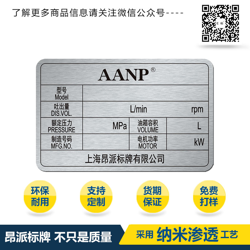 設備參數陽極氧化銘牌標牌 時間:2025-05-07 09:54:49 分類:陽極氧化銘牌 瀏覽:次 上海昂派標牌企業(yè)文化的核心理念是“標識世界,標示未來”。“標識”就是企業(yè)專注標識標牌的研發(fā)制 作,滿足市場對標識標牌的要求,以工匠之心匯造標識標牌的“世界”;“標示未來”是堅持科學的發(fā)展觀,走可持續(xù)的發(fā)展道路。以科技為基礎,市場為導向。無論產品大小都可以定做,價格優(yōu)惠合理,質量保證,交貨準時。 分享收藏: 上一個: 陽極氧化小銘牌標牌 下一個: 陽極氧化指示銘牌標牌 相關案例